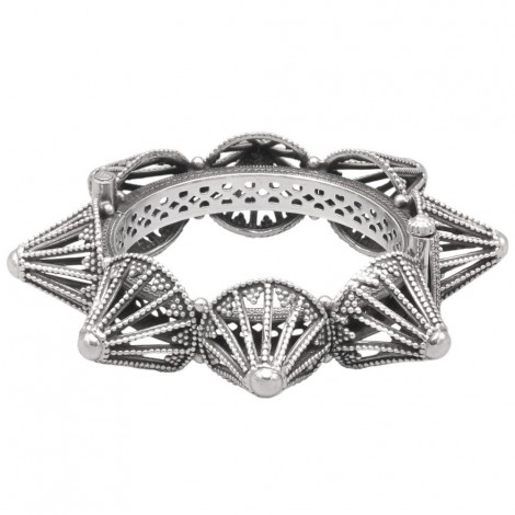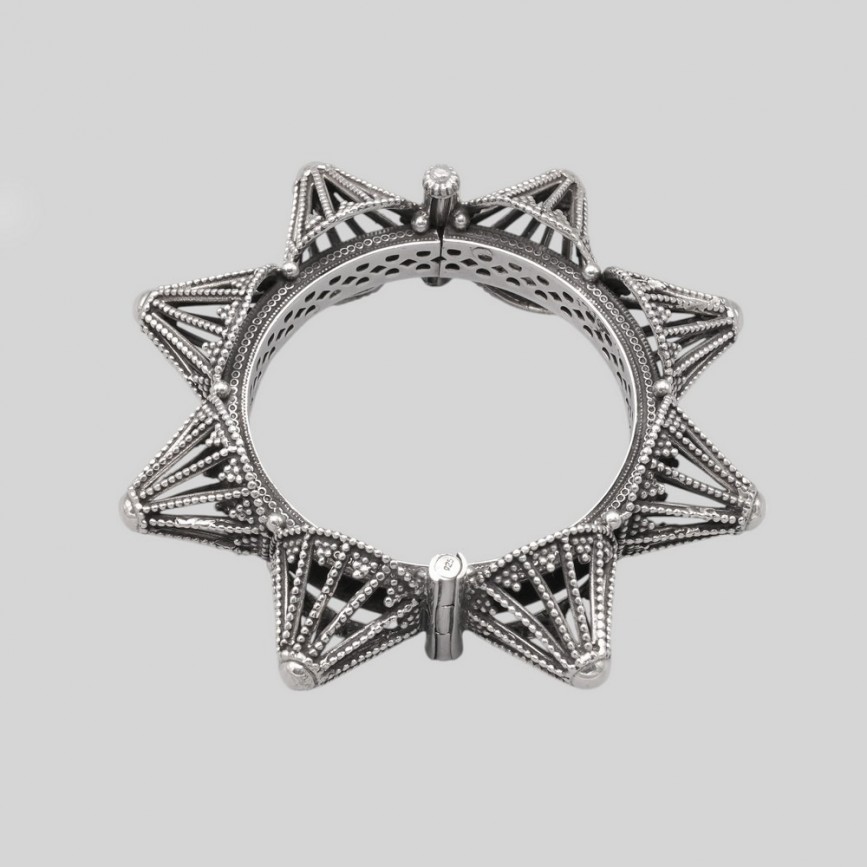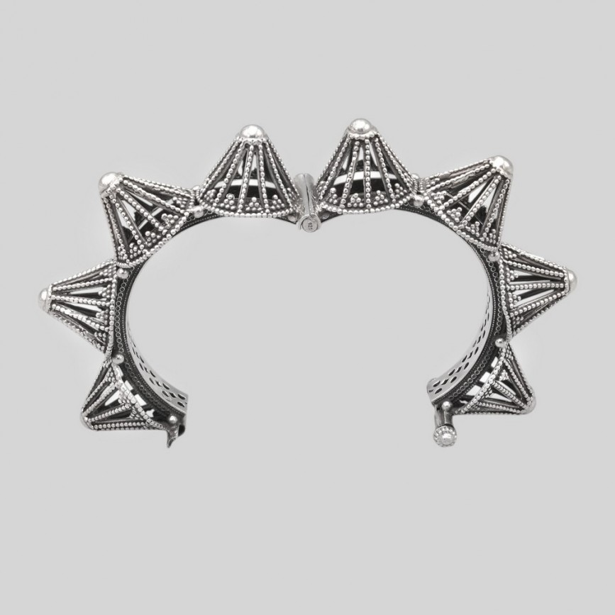 Remarcabilă brățară etnică, tip " bangle ", manufacturată în argint minuțios decorat în stil specific etnicilor berberi ( amazigh ).