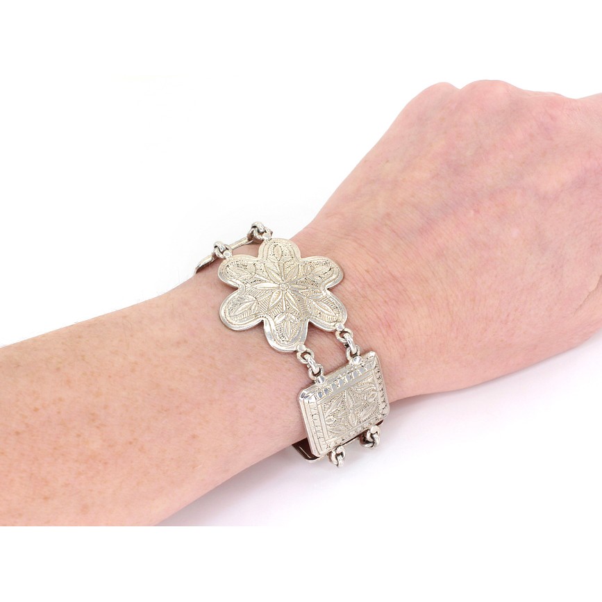 Brățara este formată din 5 elemente minuțios ornamentate prin gravare manuală cu motive etnografice Amazigh.