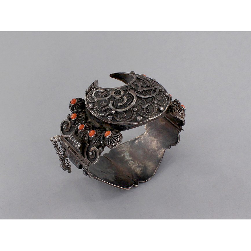 Opulentă brățară magrebiană, manufacturată în argint, decorată cu anturaje de coral roșu natural.