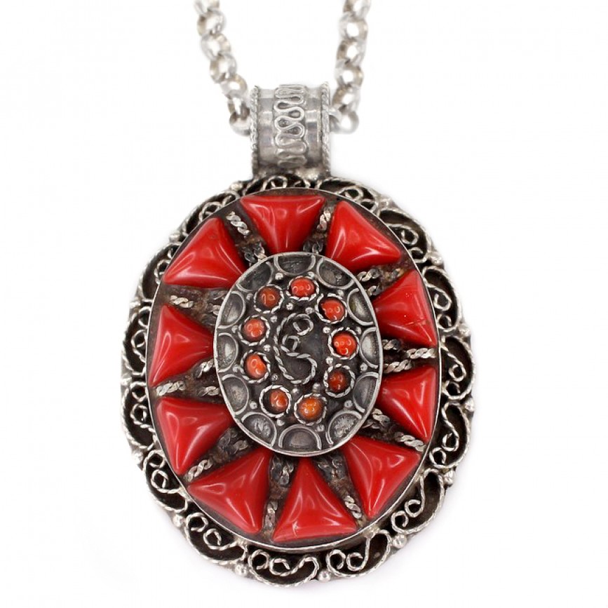 Colier din argint cu amuletă sino-tibetană decorată cu anturaje de coral | India