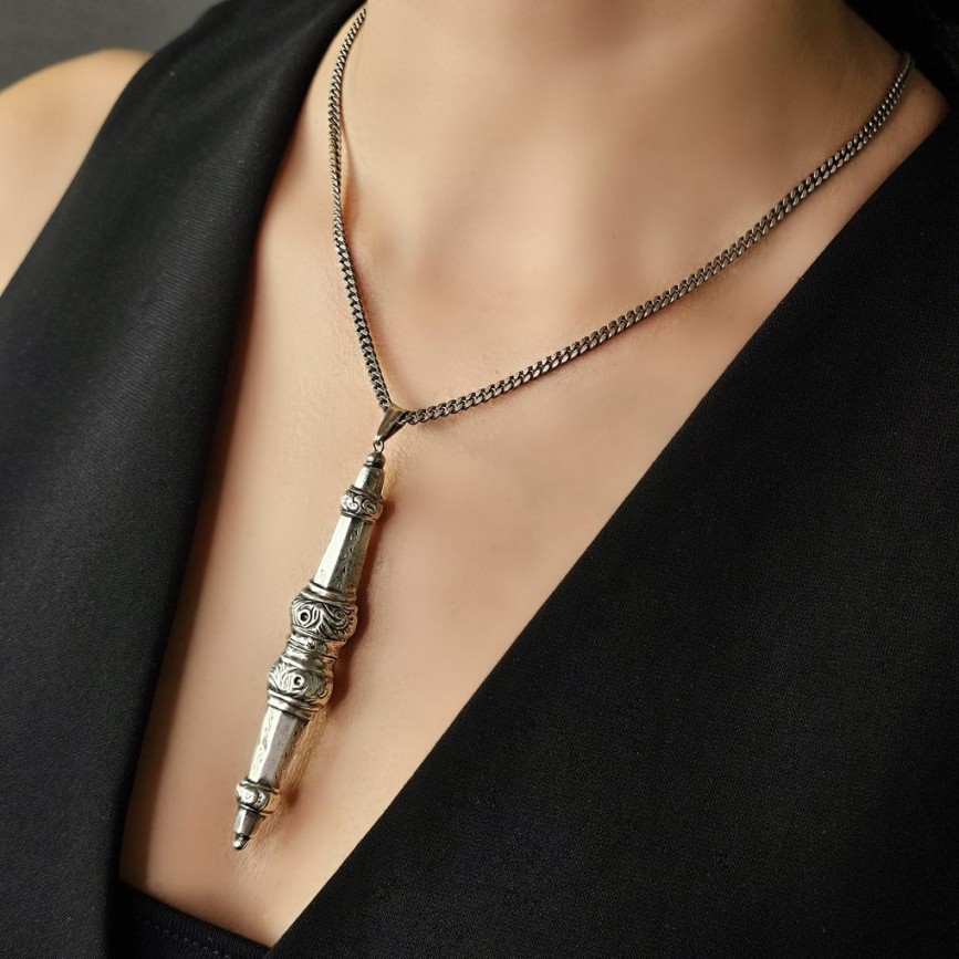 Pandantiv-etui din argint, etanș ( fără deschidere ), destinat conservării unui pergament ( jurământ, rugăciune, secret personal ).