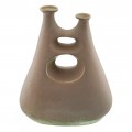 Deschiderile evazate, rezervele eliptice și baza ușor retrasă, sunt decorate cu glazură " lava ", în fuziune de nuanțe verzui, maro-pământiu și alb mat.