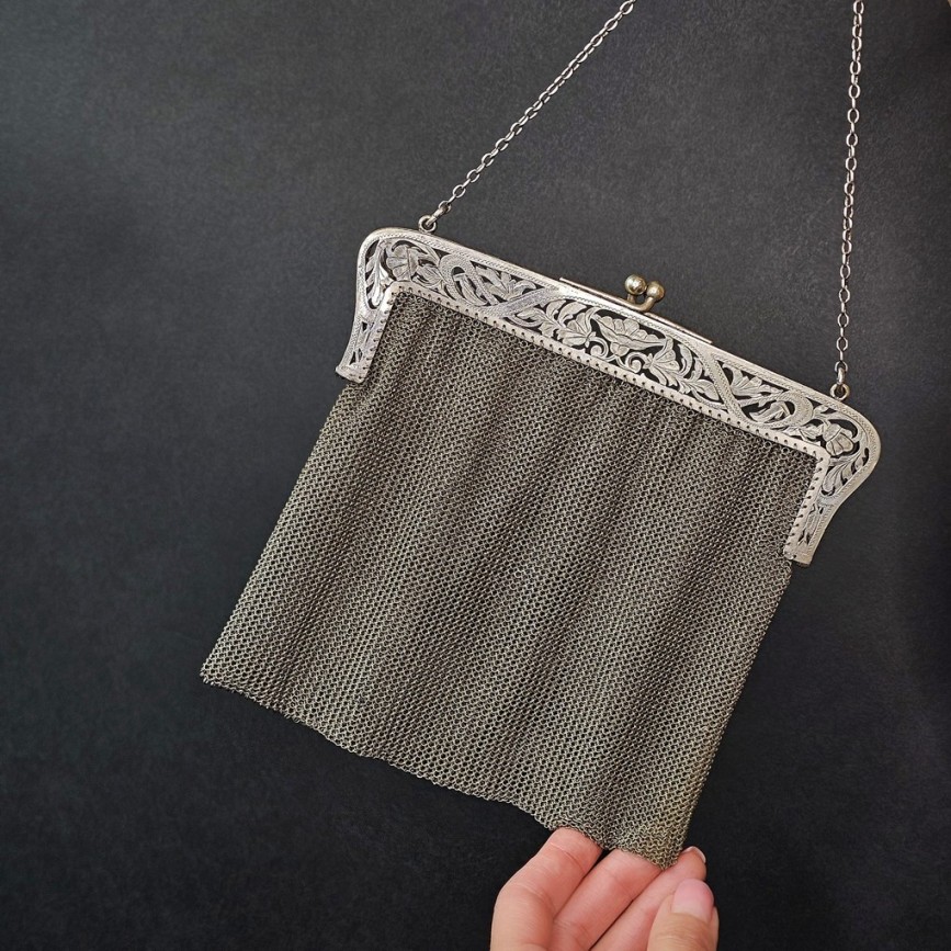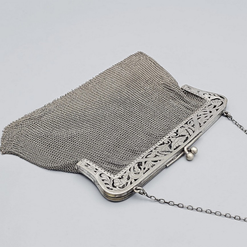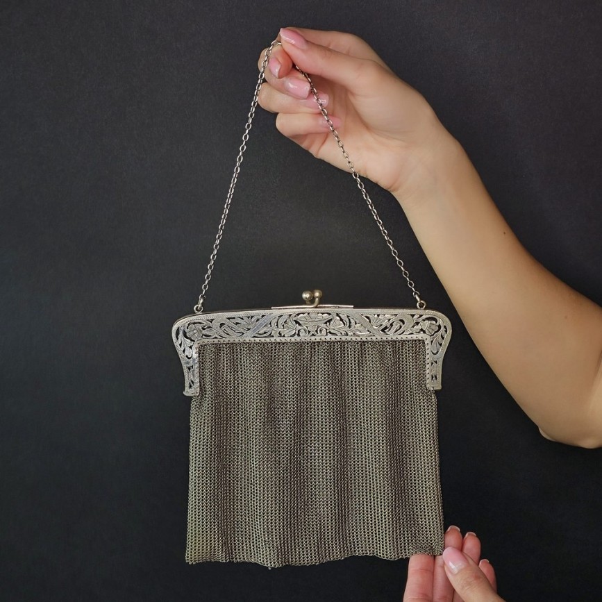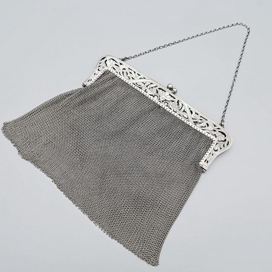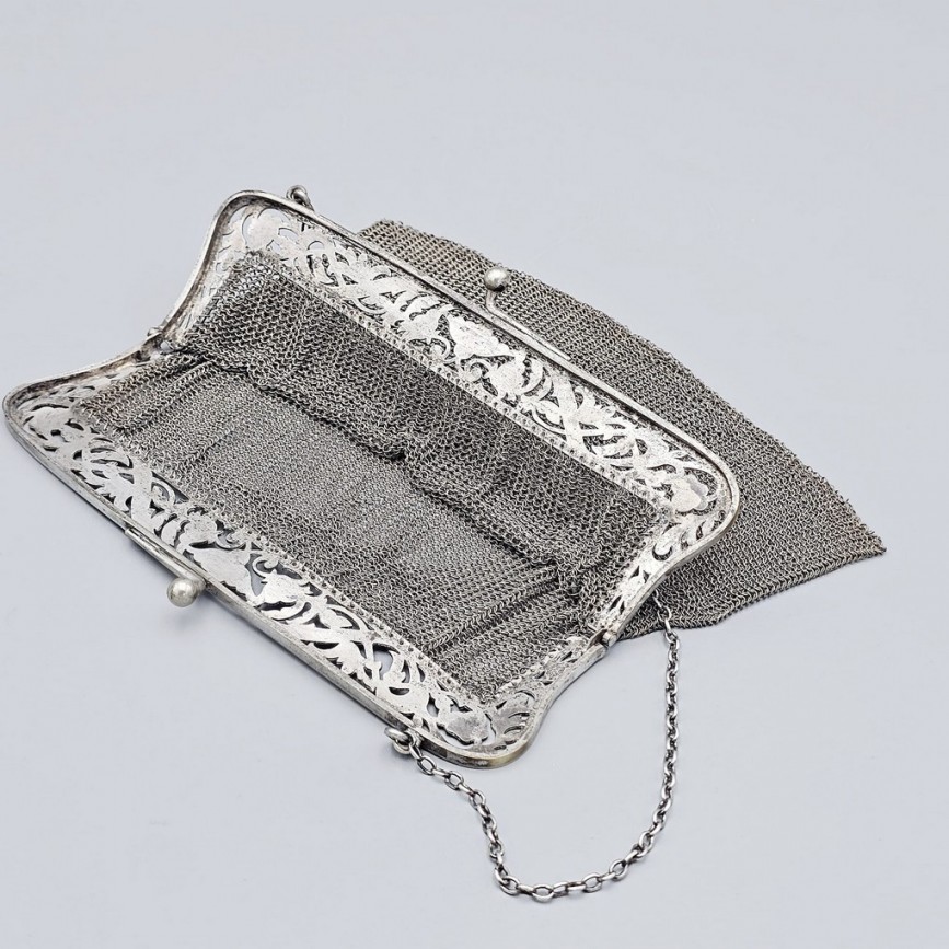 Poșetă chatelaine de perioadă Art Nouveau din alpaca argintată.