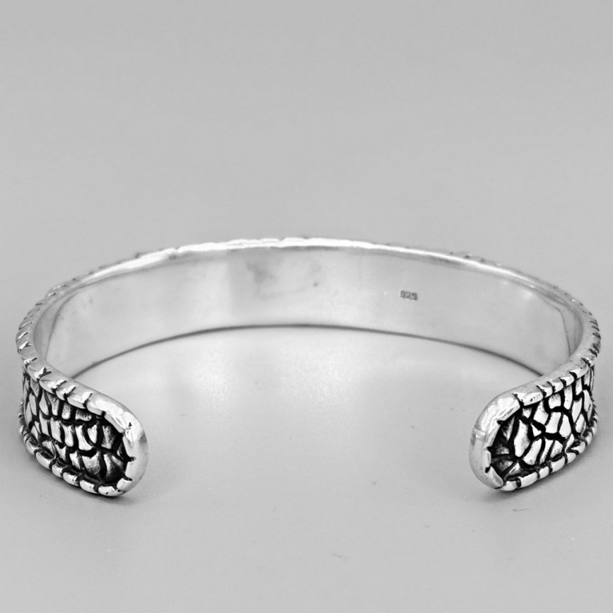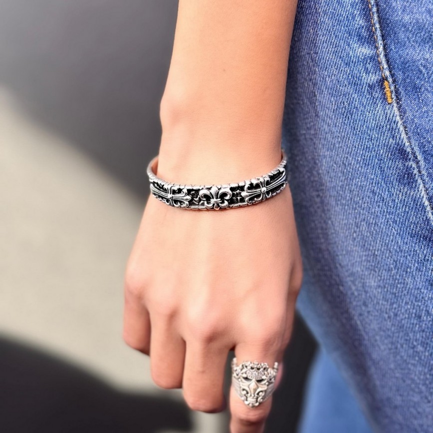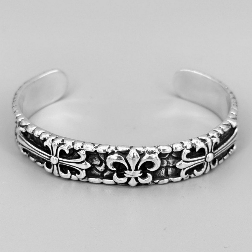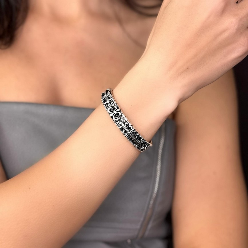 Brățară statement unisex, tip "cuff", din argint masiv, decorată cu simbolul nobiliar Fleur de Lis și cruci creștine stilizate în manieră medievală.