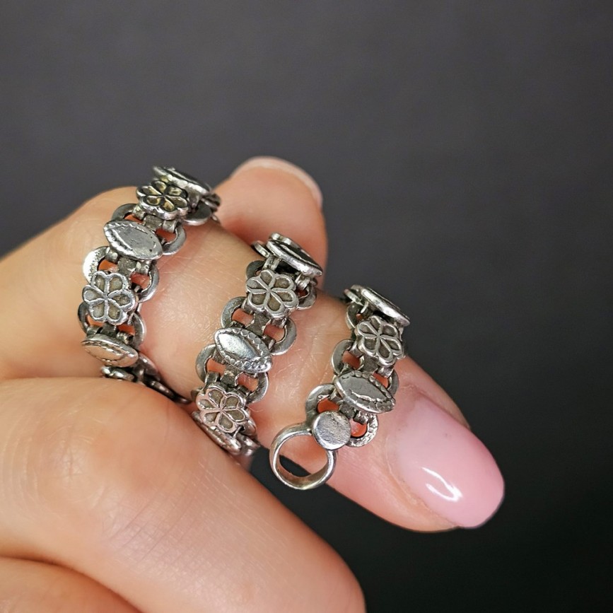 fiecare dintre ele conturat manual, cu margini punctate fin, o tehnică specifică bijuteriilor de inspirație tribală.