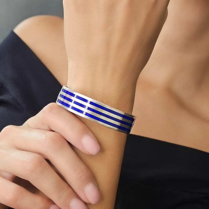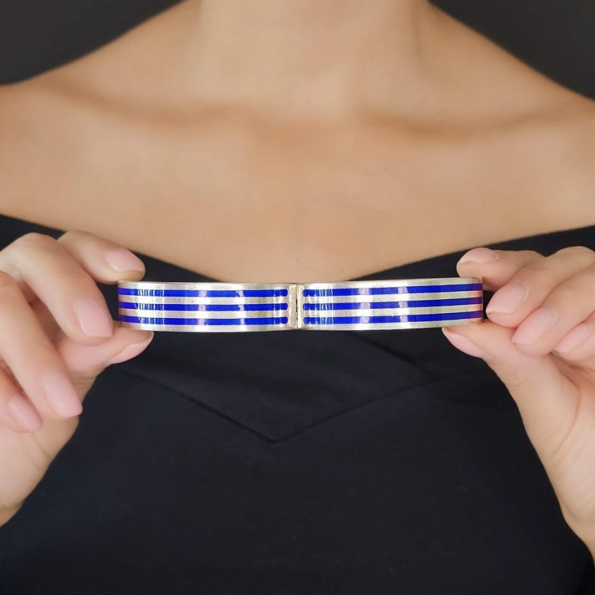 O brățară cuff de o eleganță geometrică impecabilă, realizată din argint cu inserții de email champlevé în nuanțe intense de albastru cobalt.