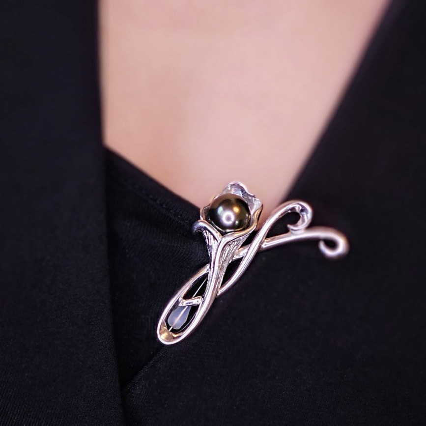 Broșă - pandant statement din argint rodinat & perlă Tahiti de cultură