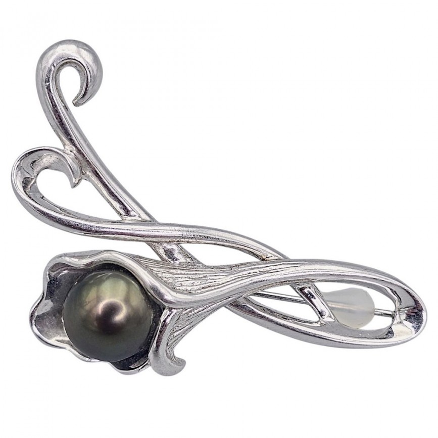 Broșă - pandant statement din argint rodinat decorată cu o remarcabilă perlă neagră Tahiti de cultură în apă sărată | cca. 1990