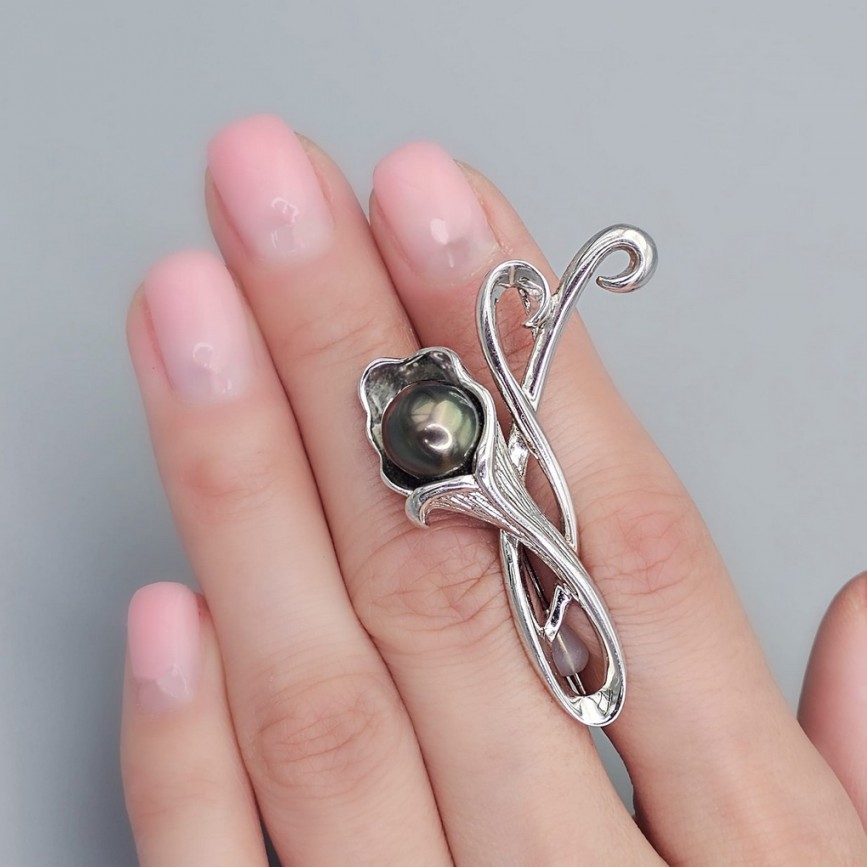 Broșă - pandant statement din argint rodinat, decorată cu o remarcabilă perlă neagră Tahiti ( South Sea ) de cultură în apă sărată.