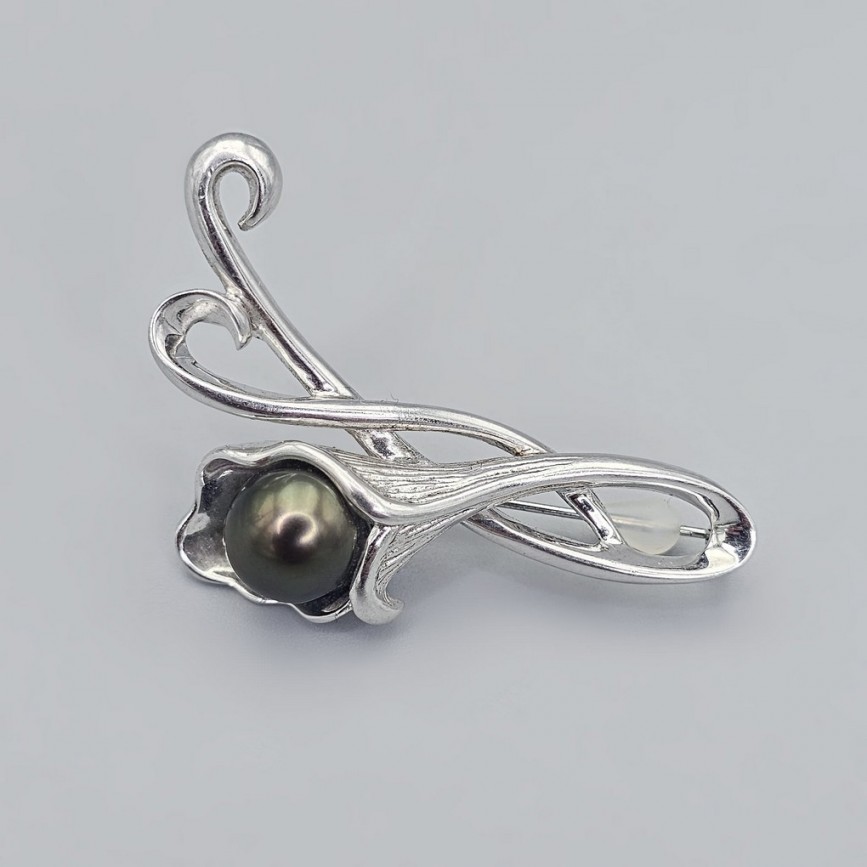 manufactură în argint turnat, patinat, presat şi cizelat; perlă tahitiană naturală
