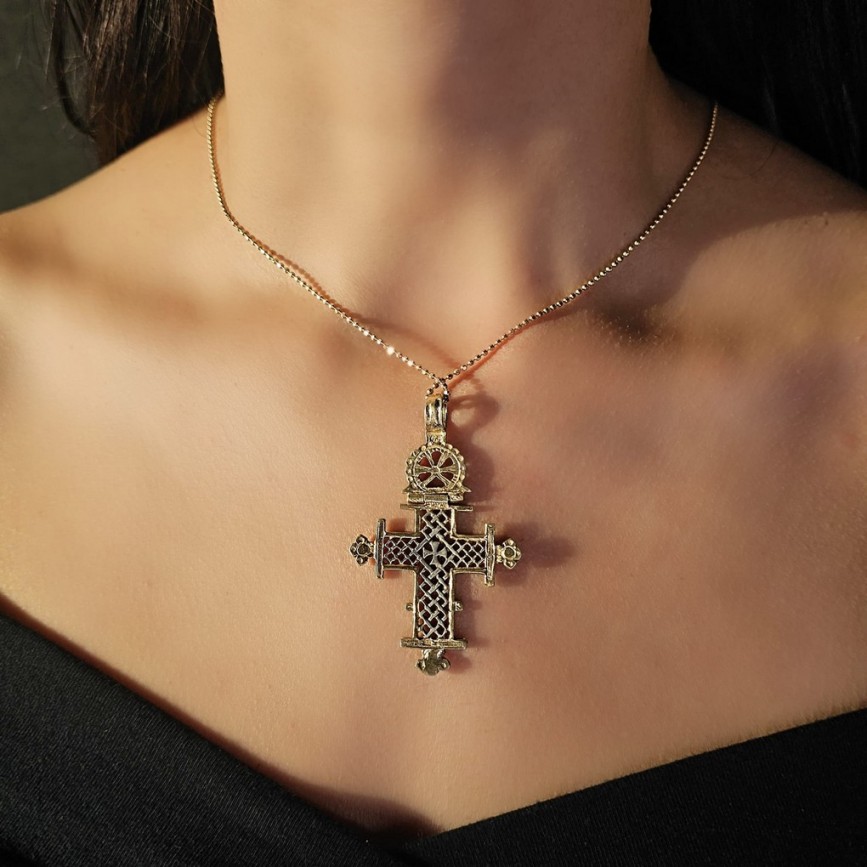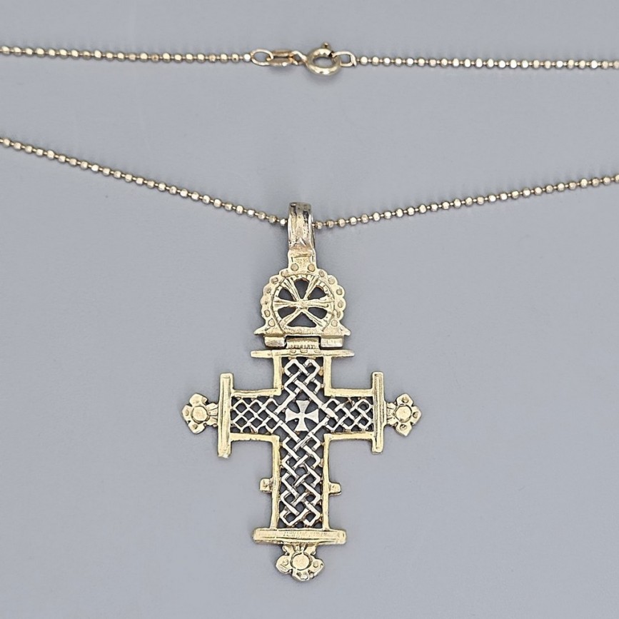 Colier din argint aurit accesorizat cu amuletă cruce coptă etiopiană, piesă de orfevrărie tradițională.