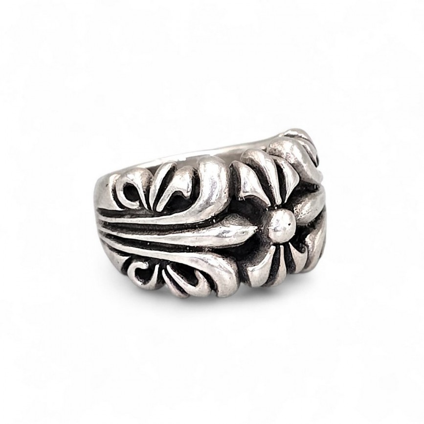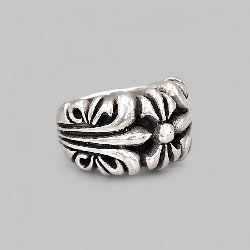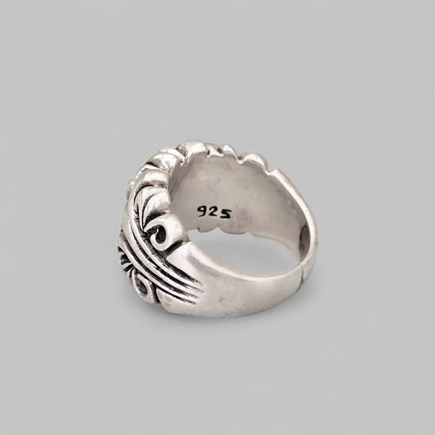 Inel din argint masiv, elaborat în jurul simbolului nobiliar fleur-de-lis, redat într-o compoziție fluidă, aproape organică.