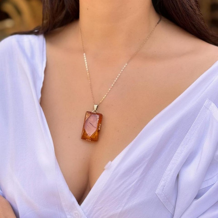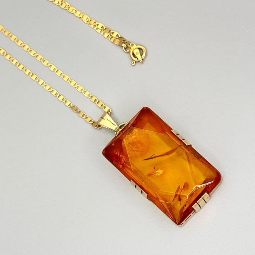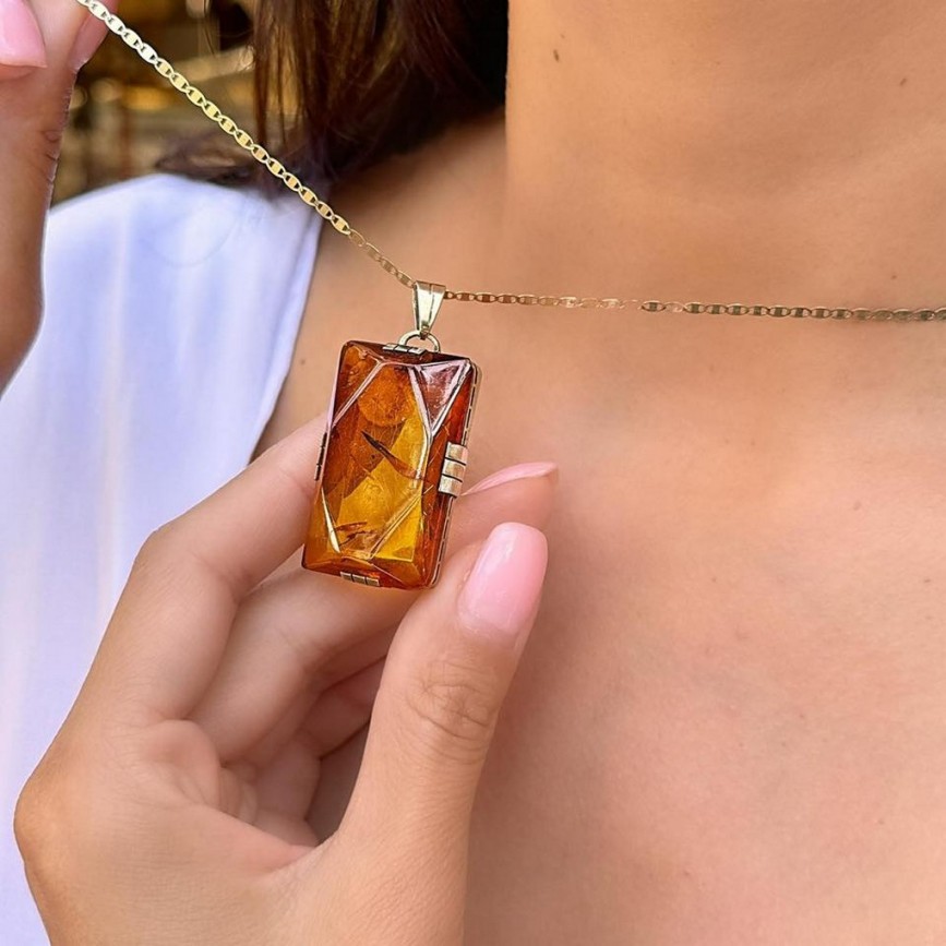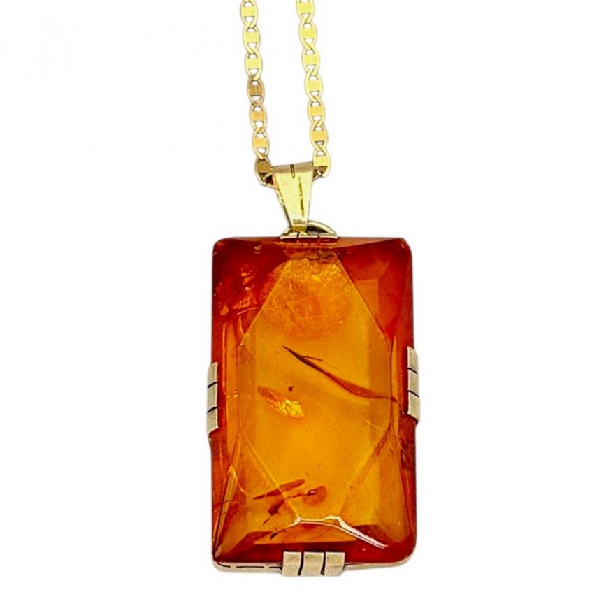 NOU Colier din argint aurit cu pandant autentic Art Deco decorat cu un anturaj de chihlimbar baltic natural | Norvegia
