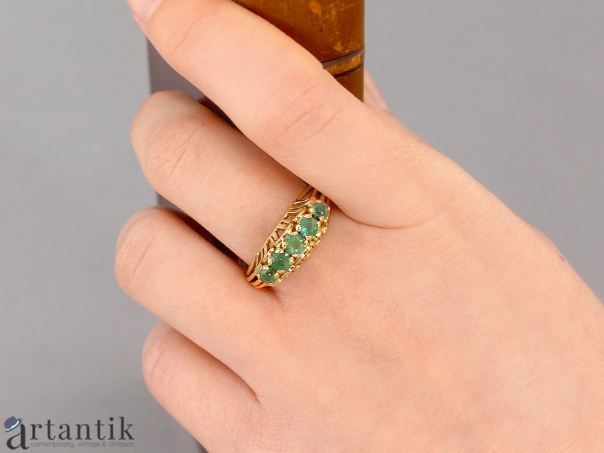 Rafinat inel vintage cu design mid-century, manufacturat în aur galben 14k, decorat cu anturaje de turmalină verde naturală: