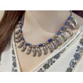 Vechi colier etnic Banjara, accesorizat cu amulete, elemente tubulare de lapis lazuli și rondele de acmarin natural.