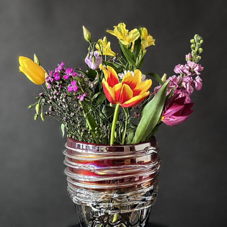 - stratificare cromatică tip sommerso, în care straturi succesive de sticlă colorată ( roșu rubiniu, tonuri de chihlimbar și zone fumurii )