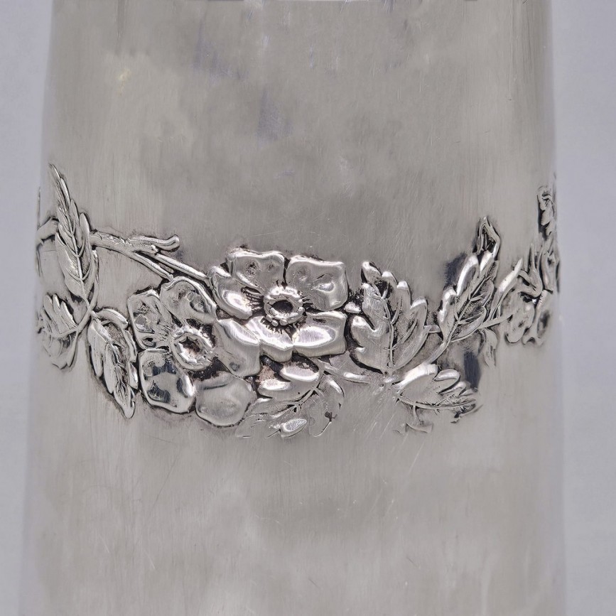 Frontal, corpul vasului, este ornamentat prin repoussé cu o ghirlandă de piersic, redată au-repousse cu o remarcabilă expresivitate artistică.