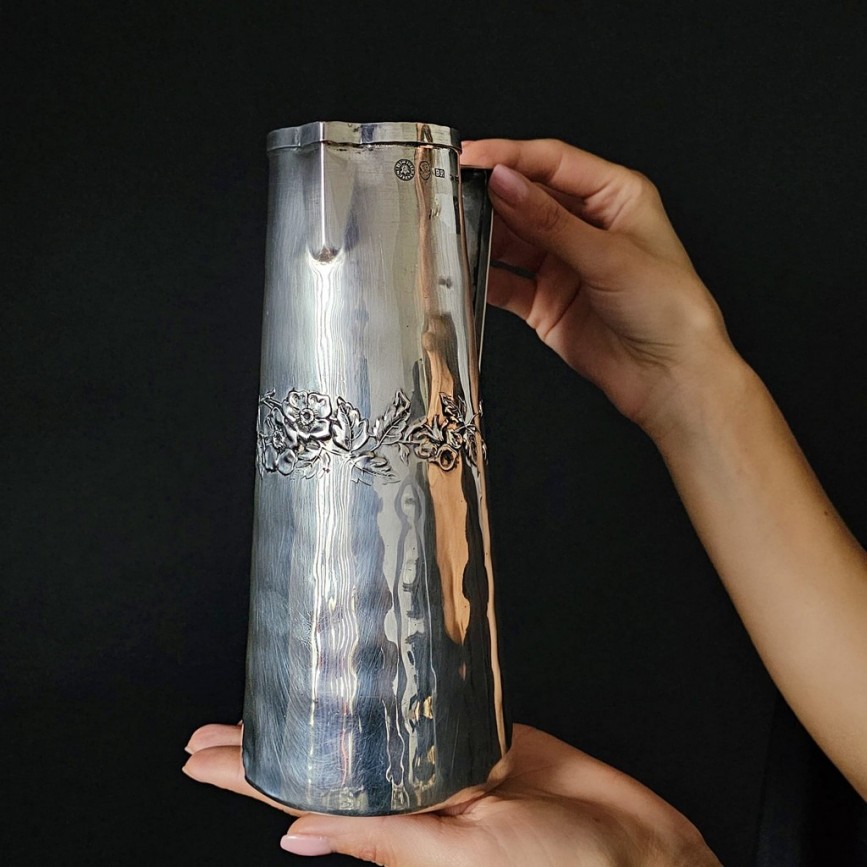 Corpul carafei este elegant texturat cu accente exprimate prin martelare fină.