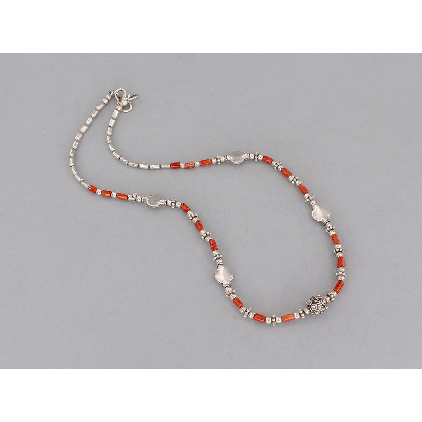 Șirag din fribre naturale, decorat din elemente sferice și distanțiere granulate și elemente geometrizate, intercalate cu anturaje tubulare de coral roșu natural.