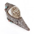Veche trâmbiță ritualică tibetană, realizată din melc Shankha îm nontură de argint ornamentat cu anturaje de coral și turcoaze naturale.