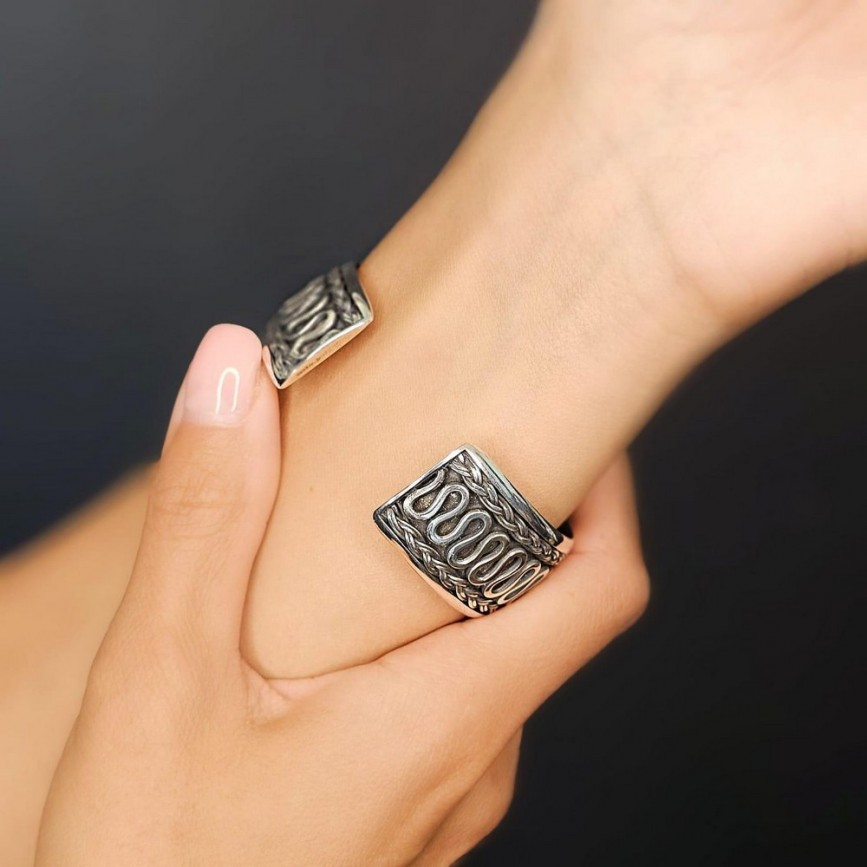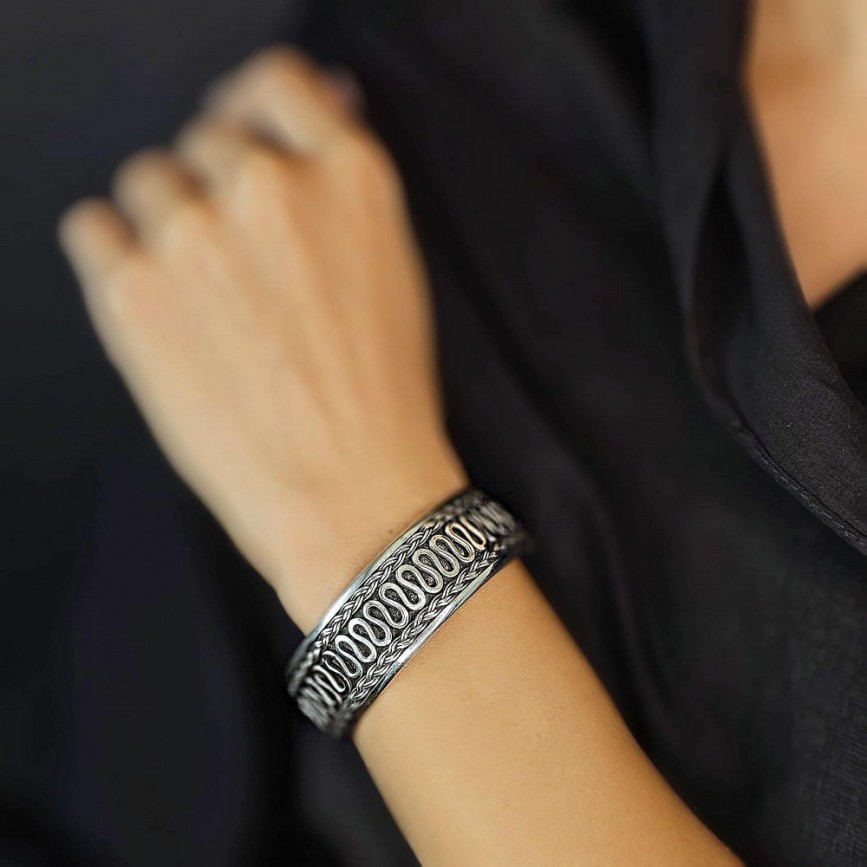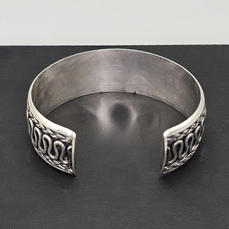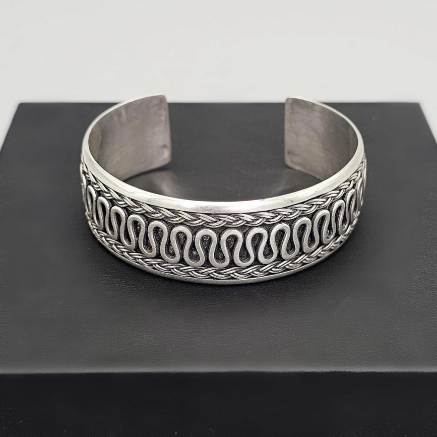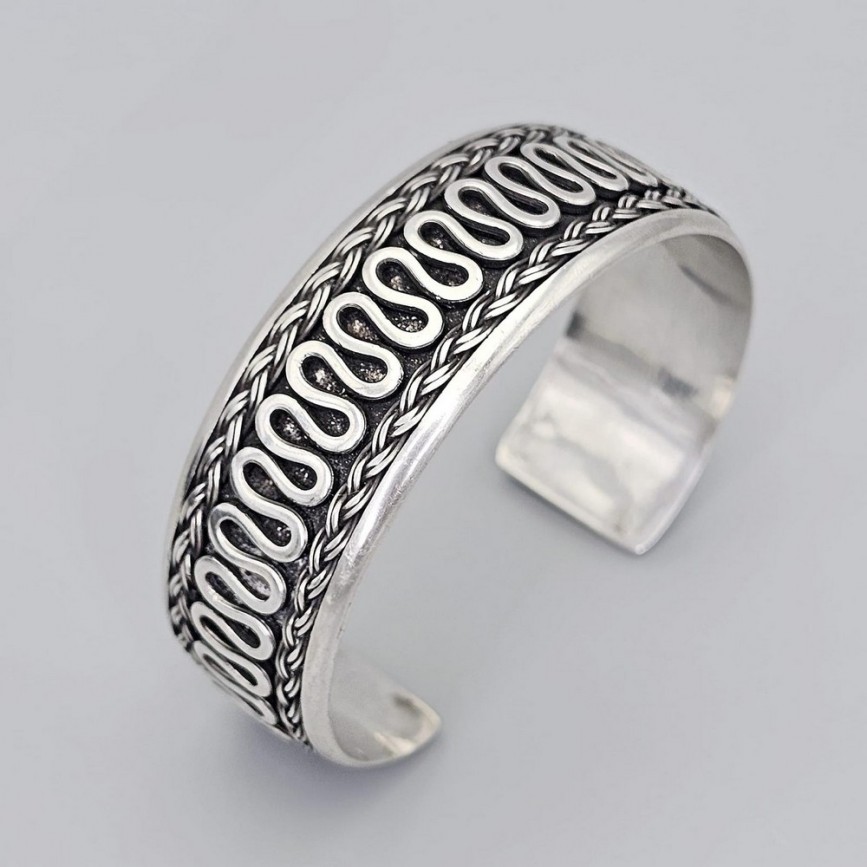 Brățară etnică balineză, model unisex, lucrată manual din argint, cu decor tradițional inspirat de motivele infinitei conexiuni.
