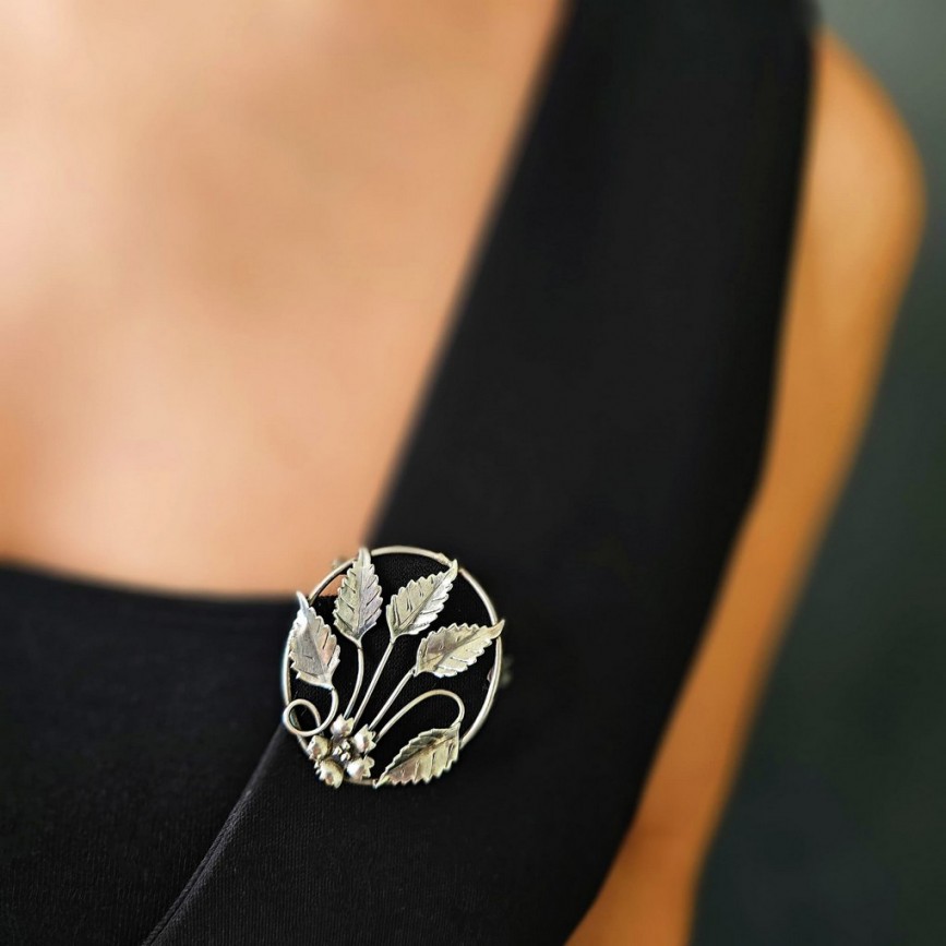 Diametrul proporționat permite purtarea atât pe rever, cât și pe rochie sau eșarfă, fiind o piesă versatilă,