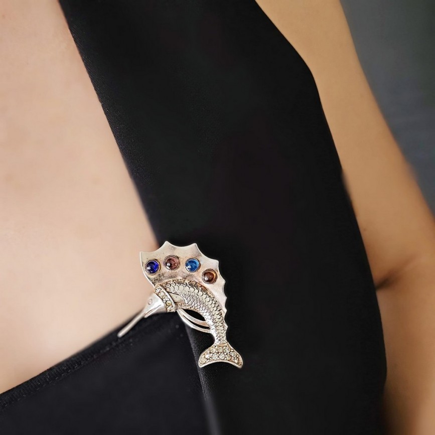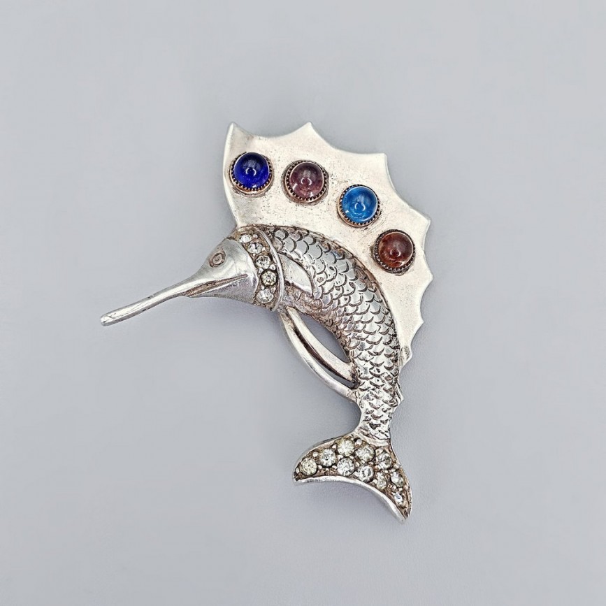 Broșă figurativă de impact, realizată din argint sterling masiv, reprezentând un pește-velă (sailfish) stilizat.