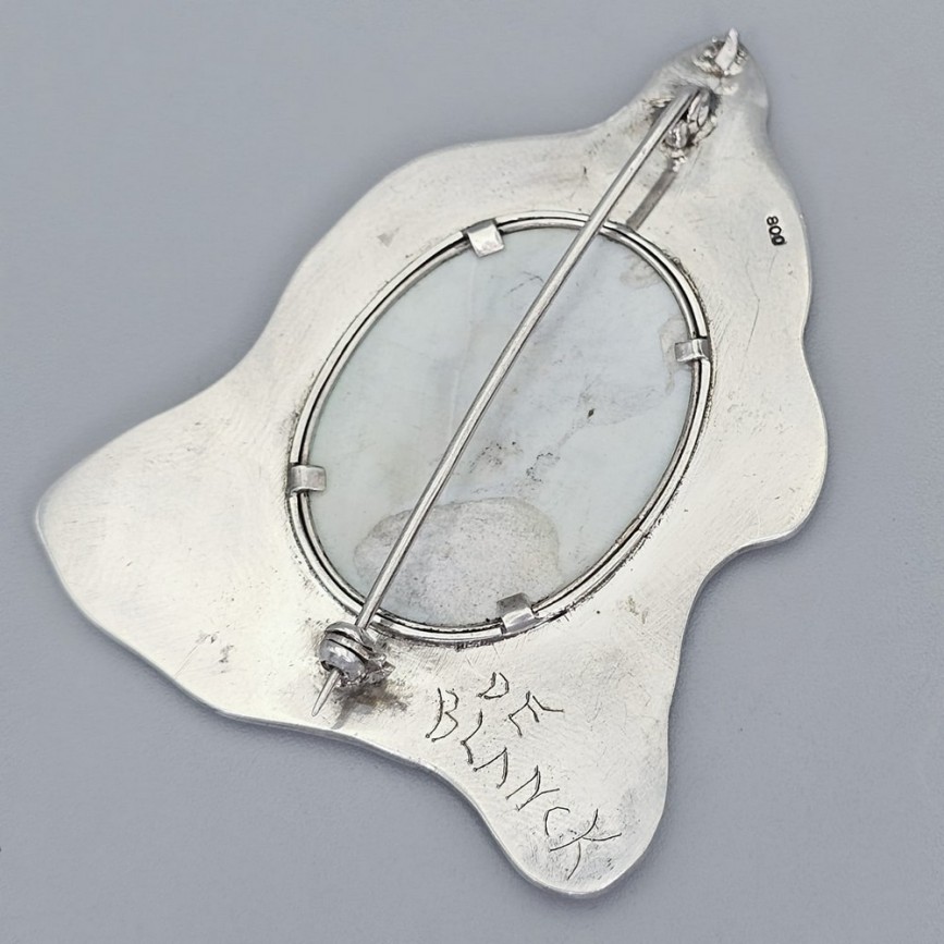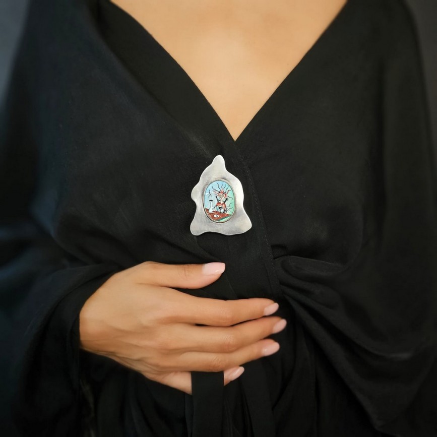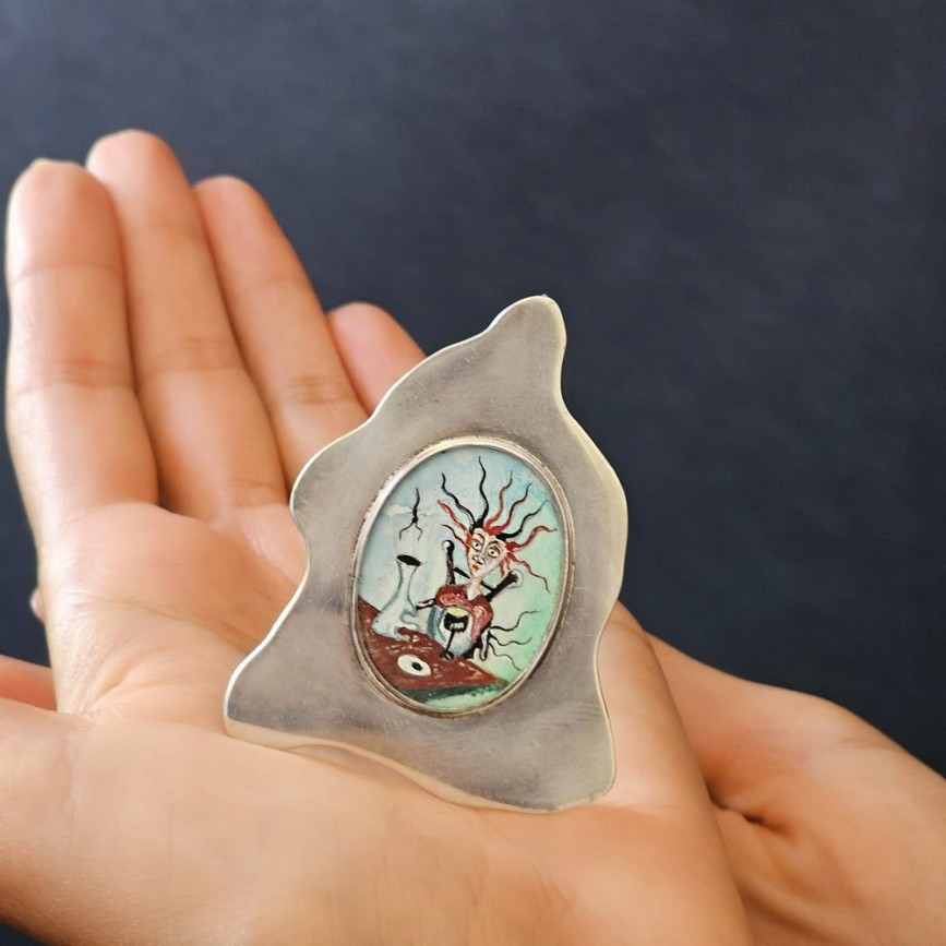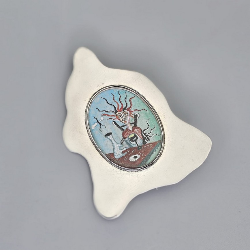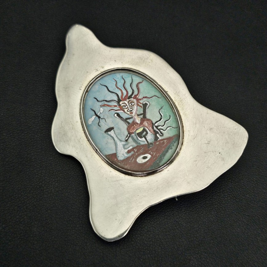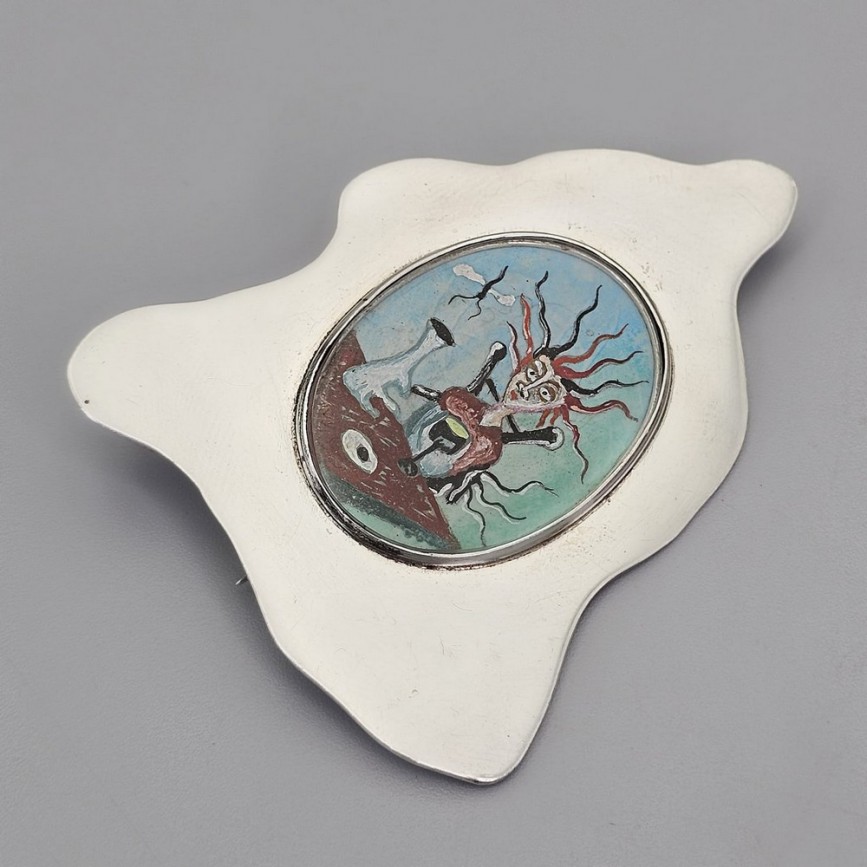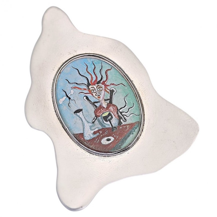 Broșă statement mid-century din argint, cu pictură originală a artistului italian Dario De Blanck (n. Milano 1944 – d. Roma 2013).