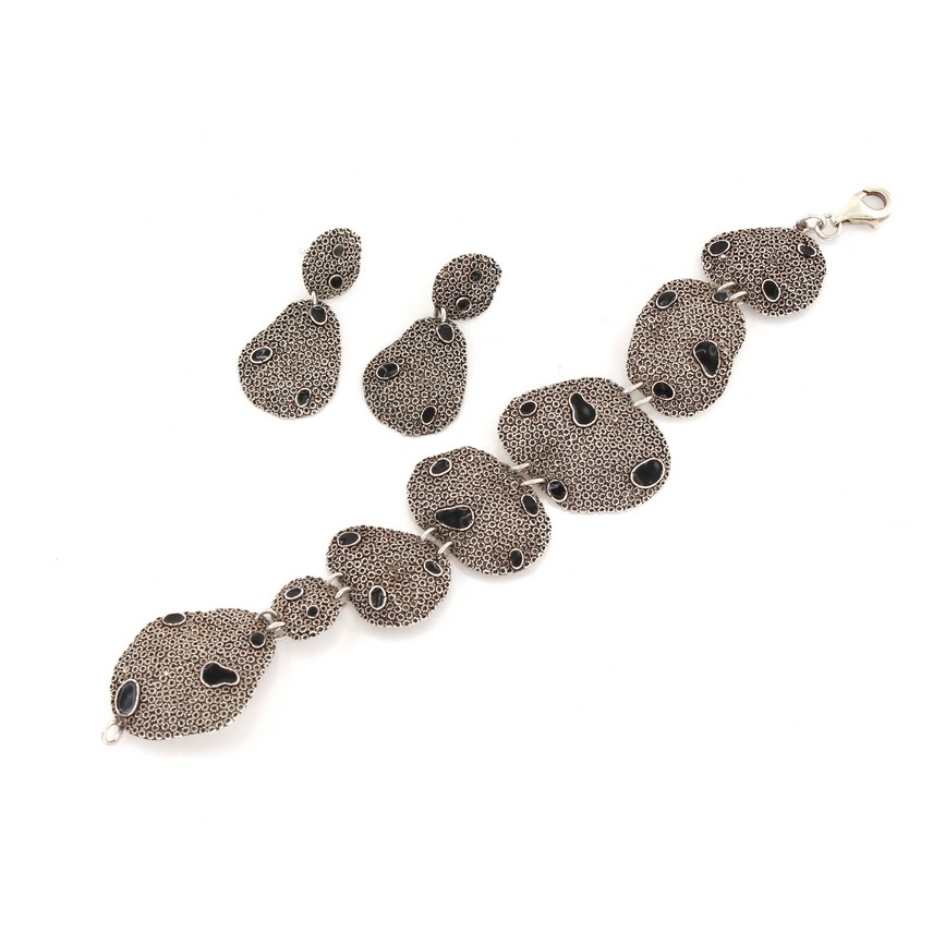 Elegant set demi-parure de bijuterii moderniste, din argint, compus din brățară și cercei stilizați îm manieră specifică designului de perioadă mid-century.