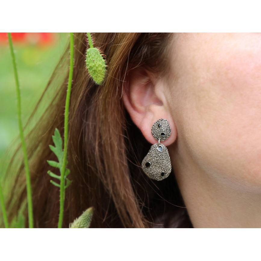 Cercei având sistem de prindere tip „pierce”, asigurat cu stoppere din argint.