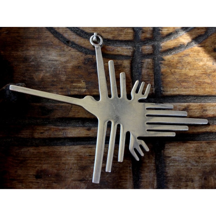 Pandantiv modernist peruvian, reprezentând o geoglifă aparținând culturii Nazca (Pasărea Colibri / en Hummingbird ).