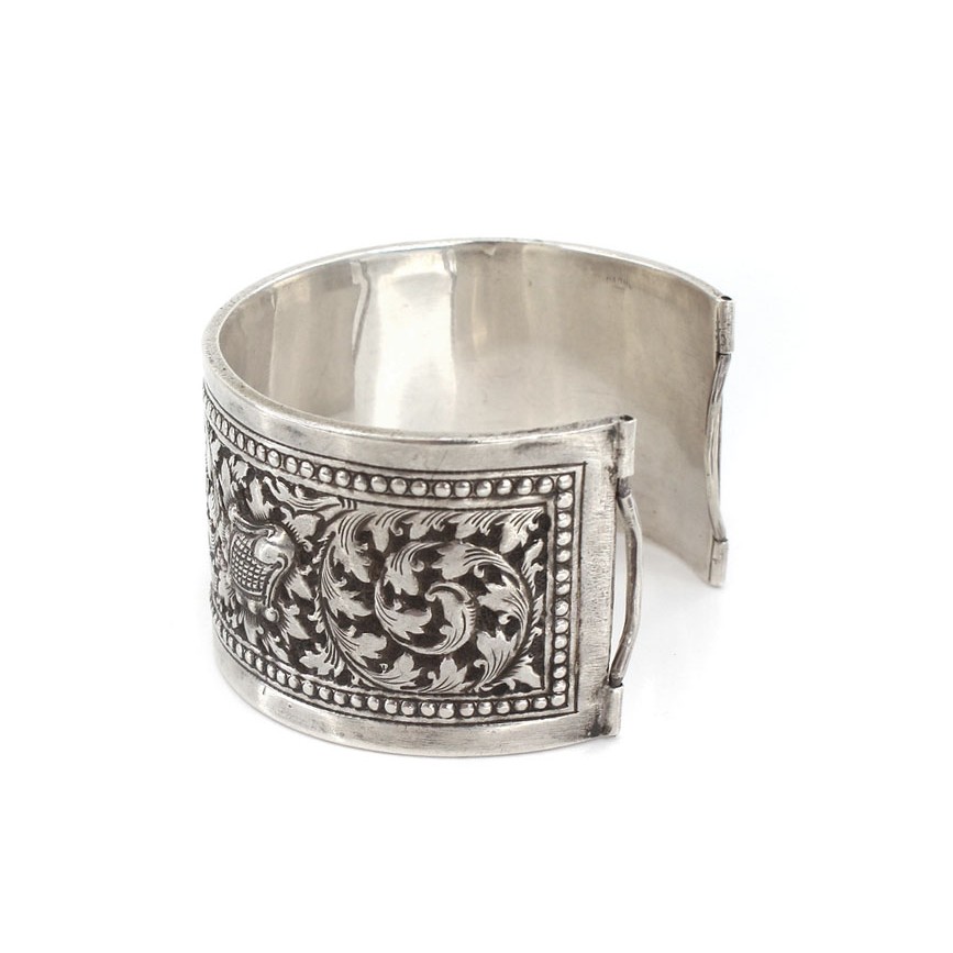 Brățară etnică cambogiană, tip „cuff”, splendid stilizată și ornamemtată în manieră specifică orfevrilor khmeri.