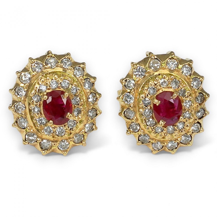 Centru cromatic este dominat de câte un rubin natural oval-fațetat, de culoare roșu intens,