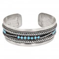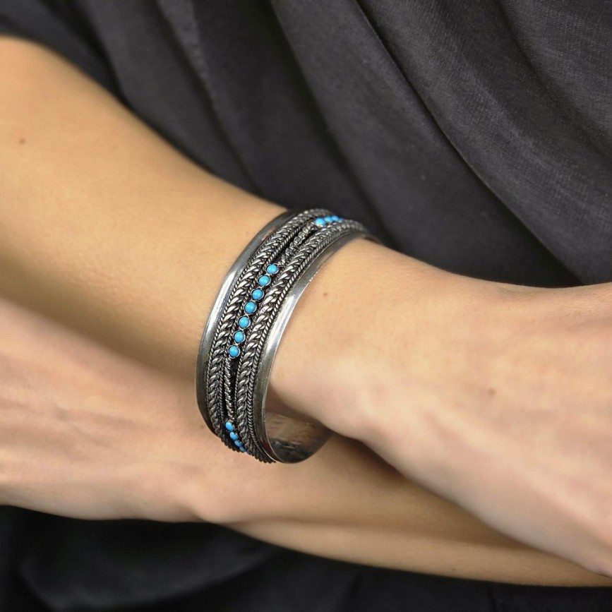 Veche brățară statement, unisex, manufacturată în argint decorată cu turcoaze naturale.
