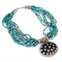 Vandut Colier choker din argint cu impresionantă amuletă Gau tibetană decorată cu turcoaze himalayene, lapis lazulii și corale | Nepal cca.1950