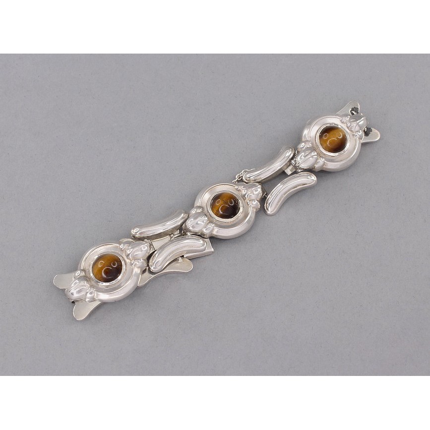 Brățară modernistă de perioadă mid-century cu design de factură Atomic Age, decorată cu anturaje de cuarț metamorfic " ochi de tigru ".
