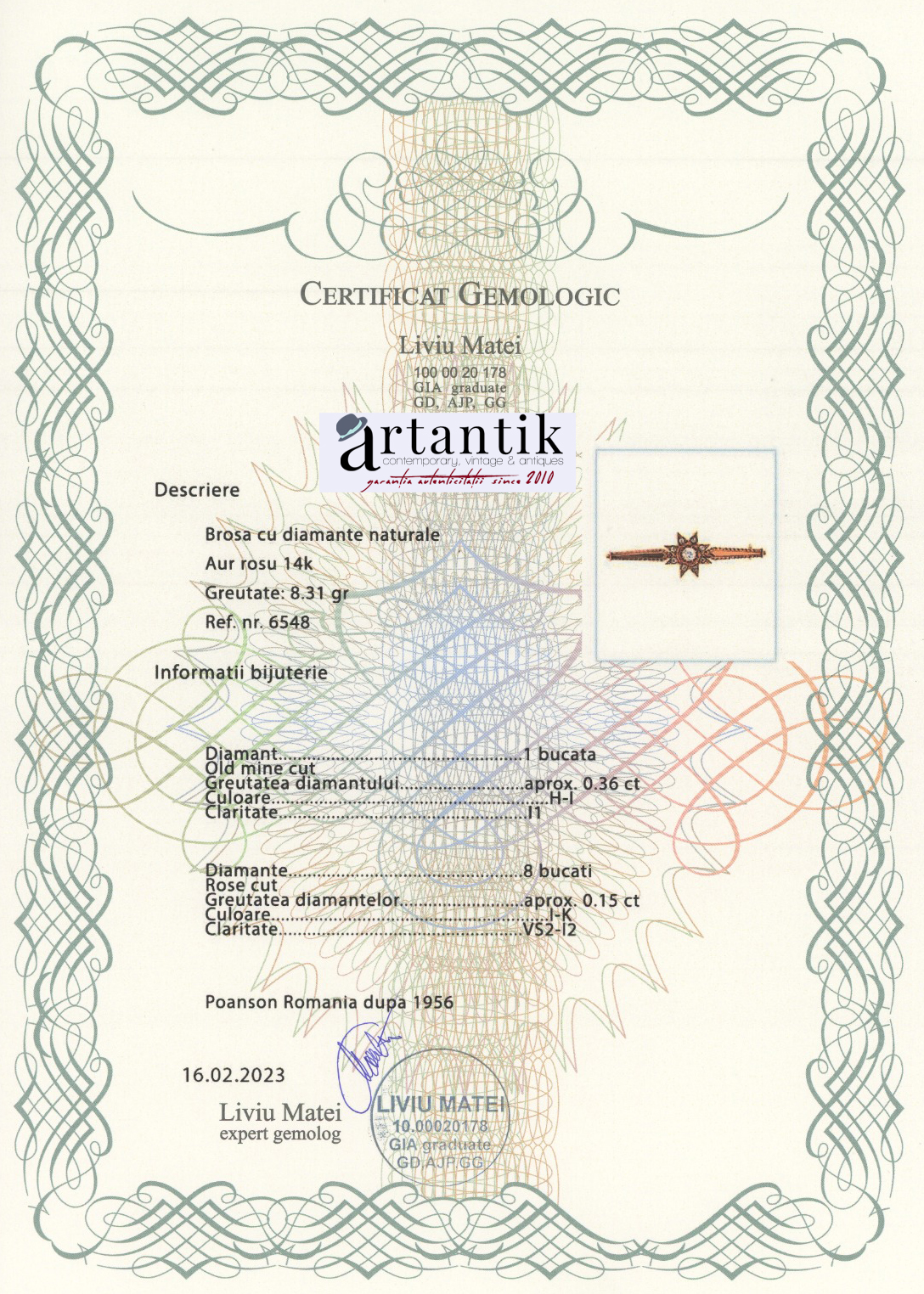 Broșa se livrează însoțit de certificat de autenticitate și expertiză gemologică (Expert Liviu Matei - GIA graduate, GD, AJP, GG cu nr. 100 00 20 178)