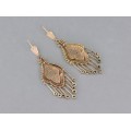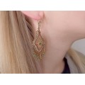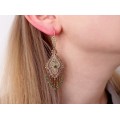 Cercei victorieni din aur galben 14k, rafinat stilizați în manieră specifică podoabelor antice etrusce, decorați cu smaralde naturale și perluțe faux: