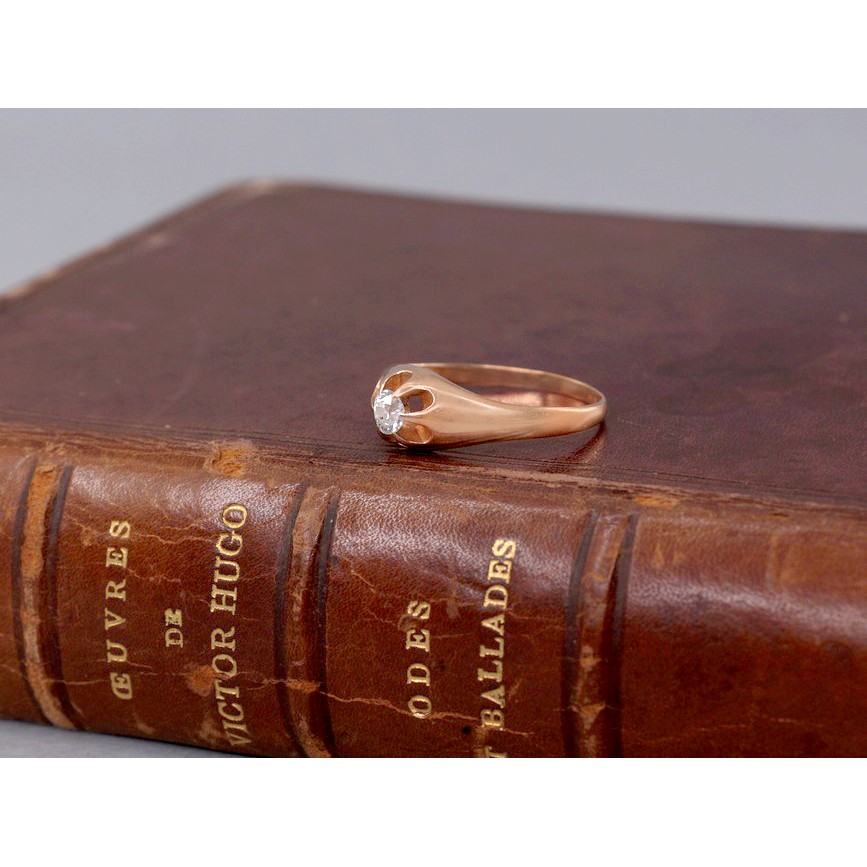 Inel victorian , de logodnă, tip " solitaire " manufacturat în aur roz 14 K, decorat cu un diamant natural: