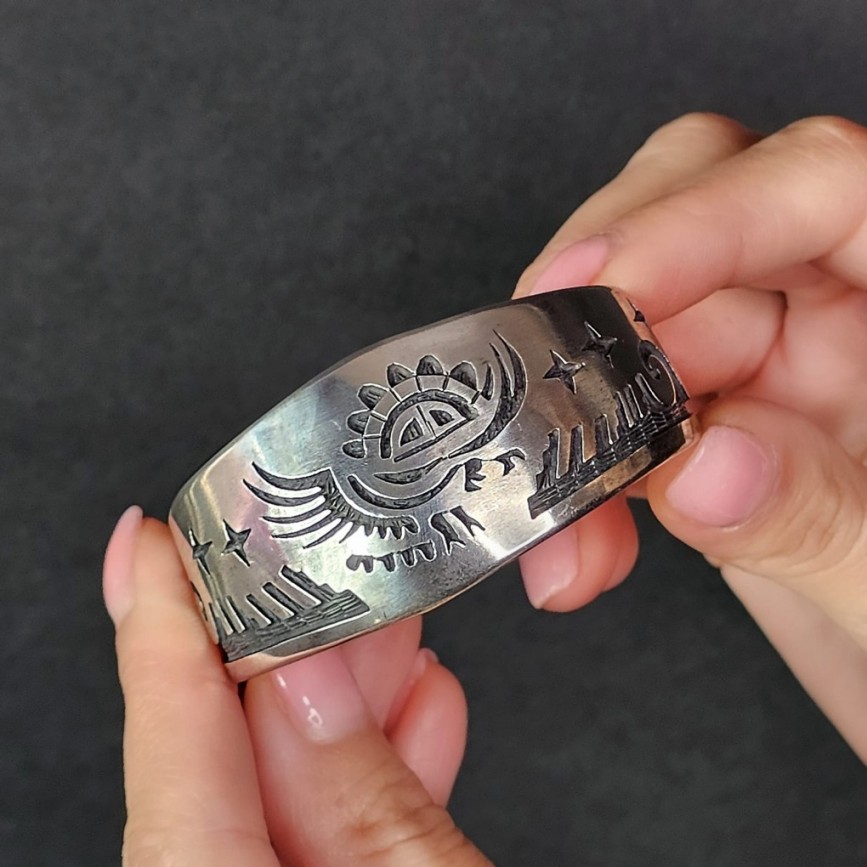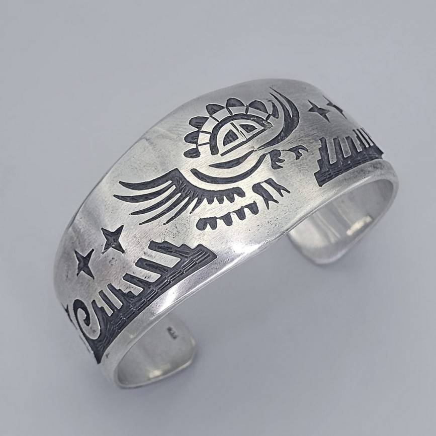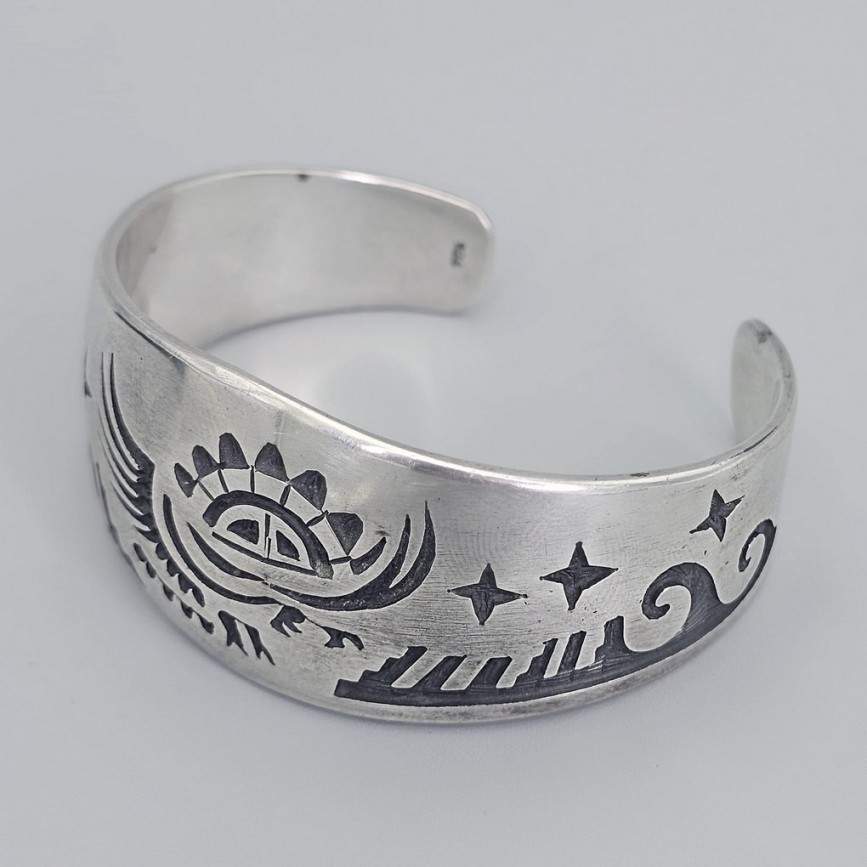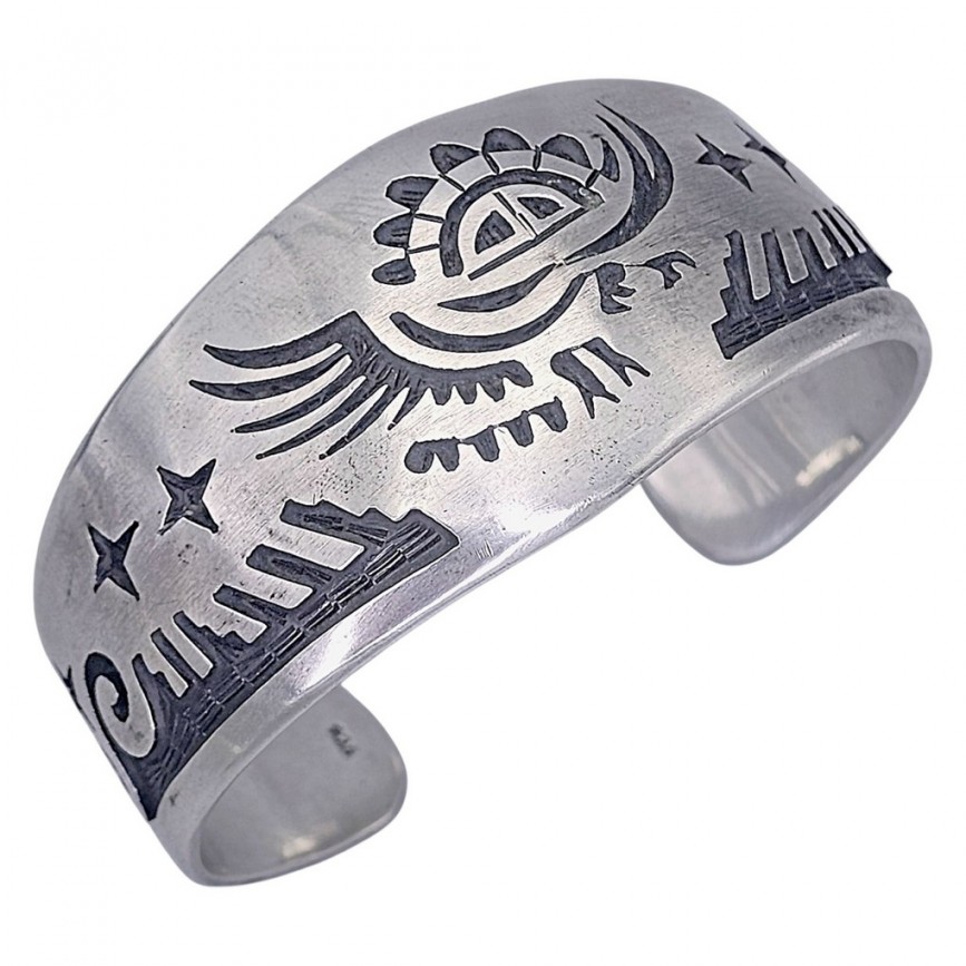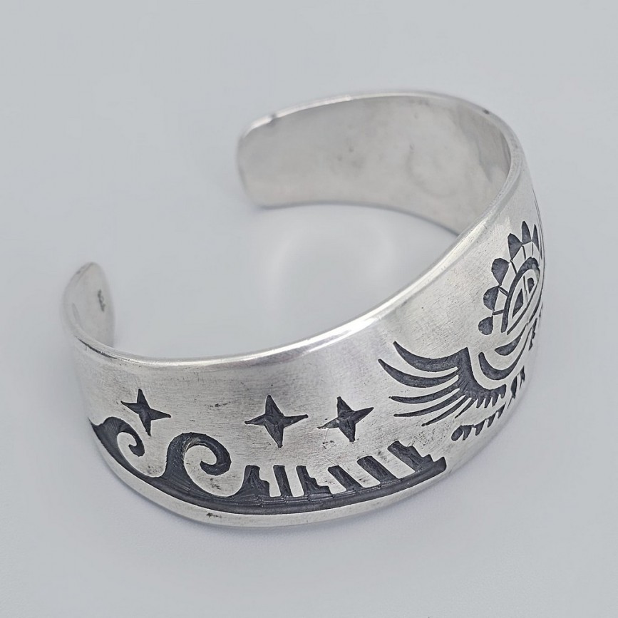 Brățară cuff amerindiană din argint decorară cu motive etnice Pueblo - South Western | Statele Unite cca. 1980 - 1990