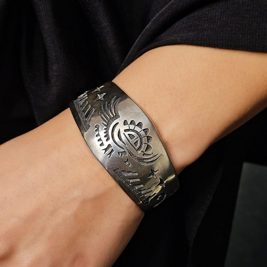 Brățară modernistă amerindiană din argint decorată cu motive etnice Pueblo