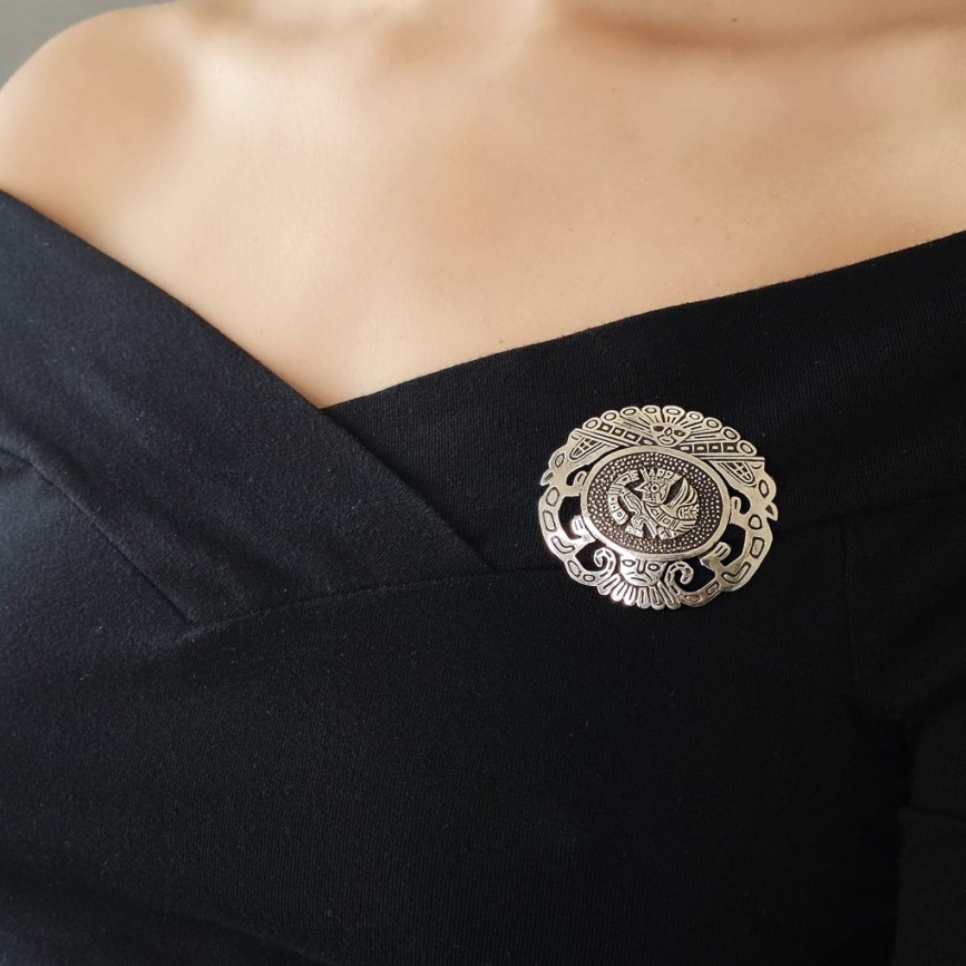 Broșă - pandant statement peruviană Inca Revival din argint decorat cu motive iconografie precolumbiene.