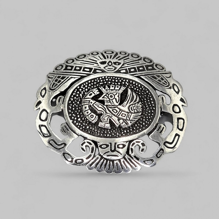 Broșă - pandant statement peruviană Inca Revival din argint decorat cu motive iconografie precolumbiene | 1970 - 1990