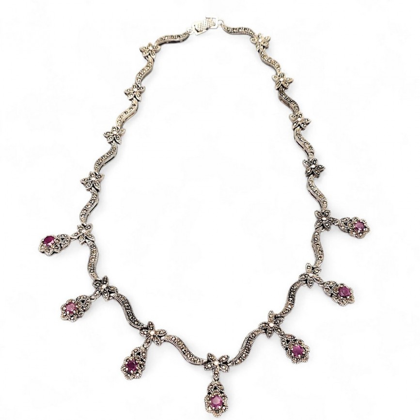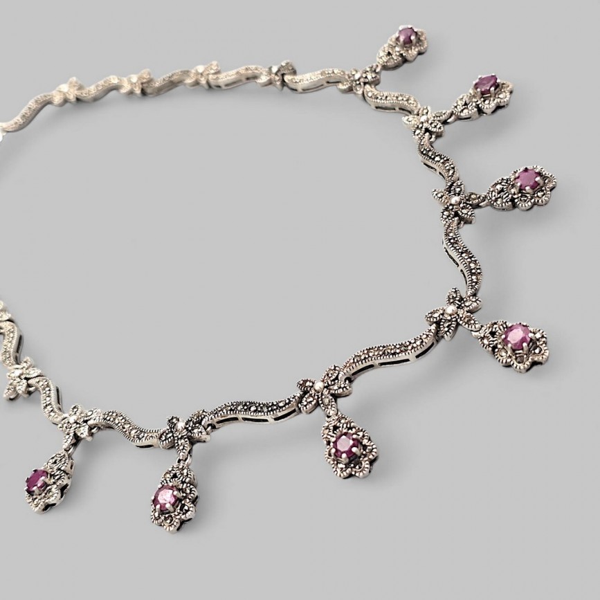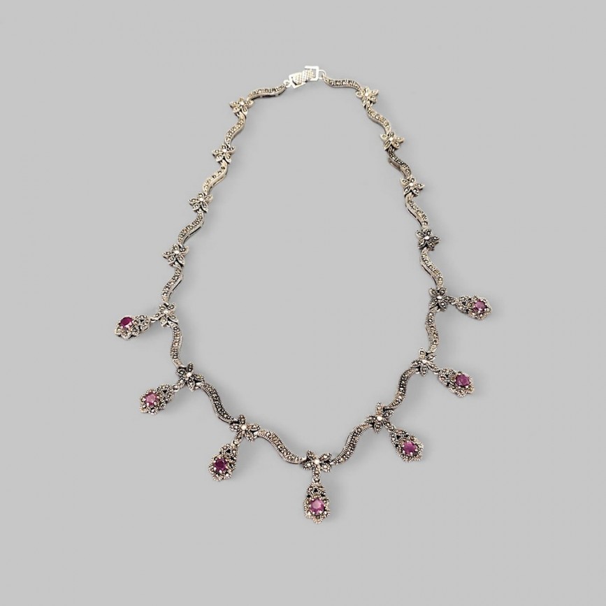 Colier feston Art Deco din argint cu rubine naturale și marcasite