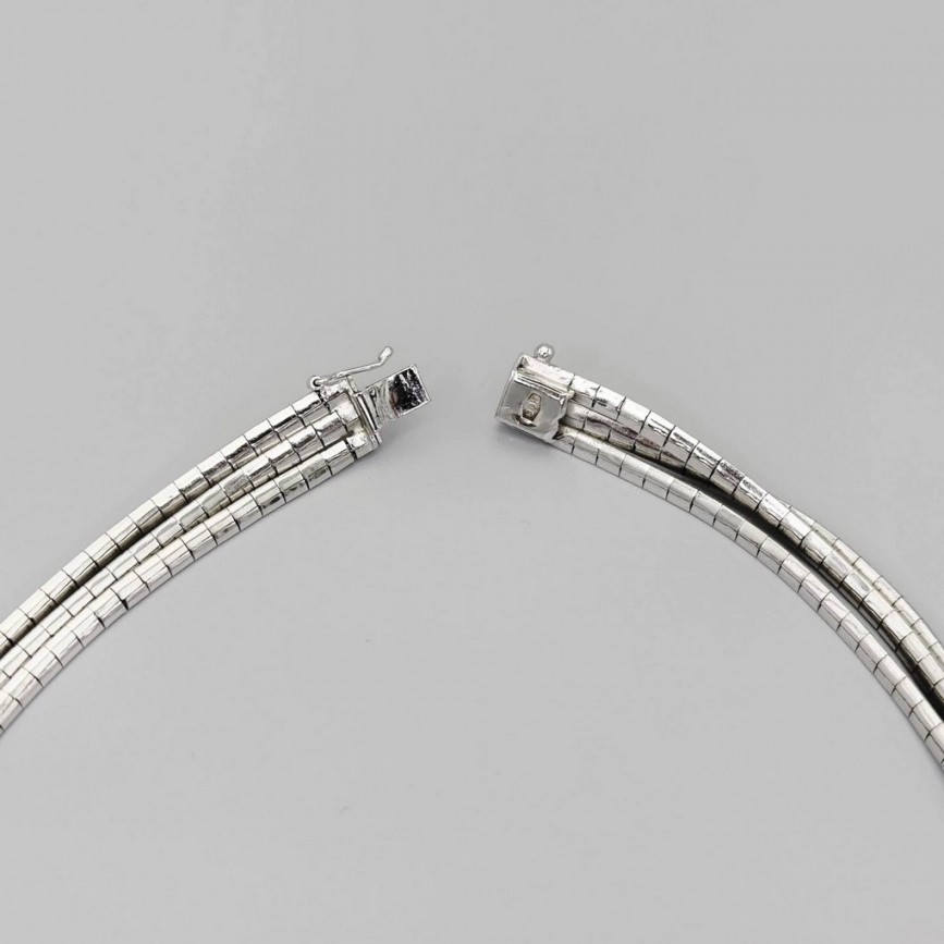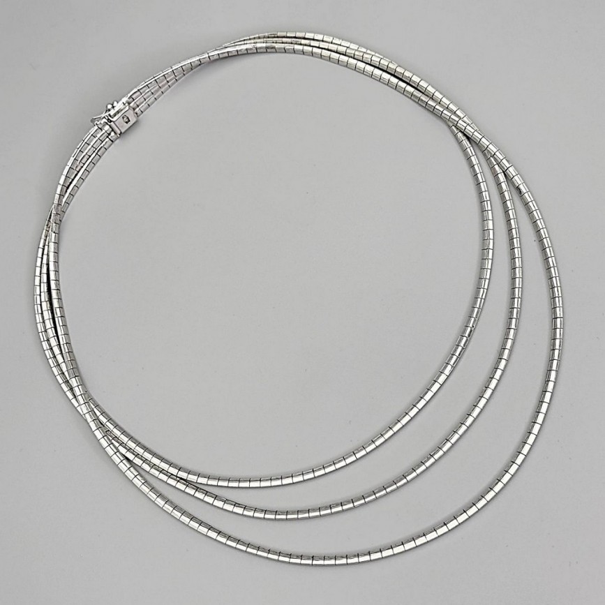 Finisat cu un strat de rodiu pentru a-i conferi rezistență și un luciu rece, uniform, colierul reflectă idealurile modernismului târziu: