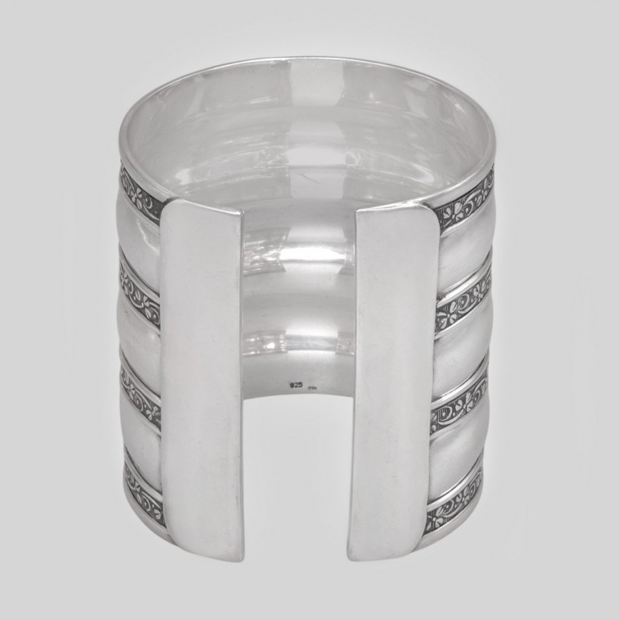 Opulentă brățară etnică indoneziană, tip „manchette”, manufacturată în argint masiv.