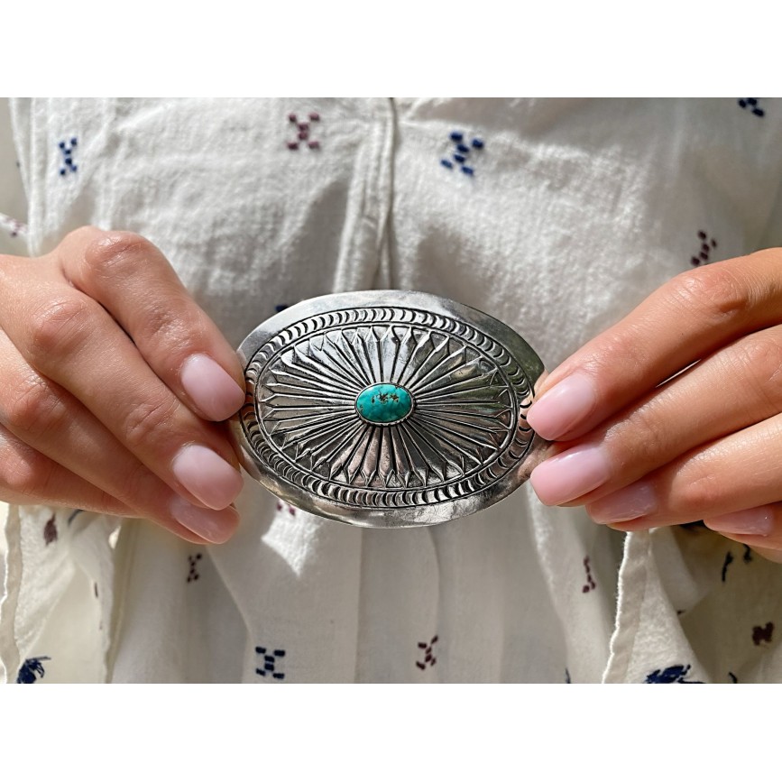 Pafta etnică amerindiană, decorată cu un remarcabil specimen de turcoaz natural Carico Lake.