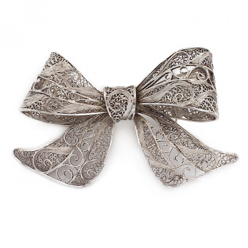 Broșă statement, manufacturată prin tehnica filigranării în argint , rafinat stilizată sub forma unei funde.