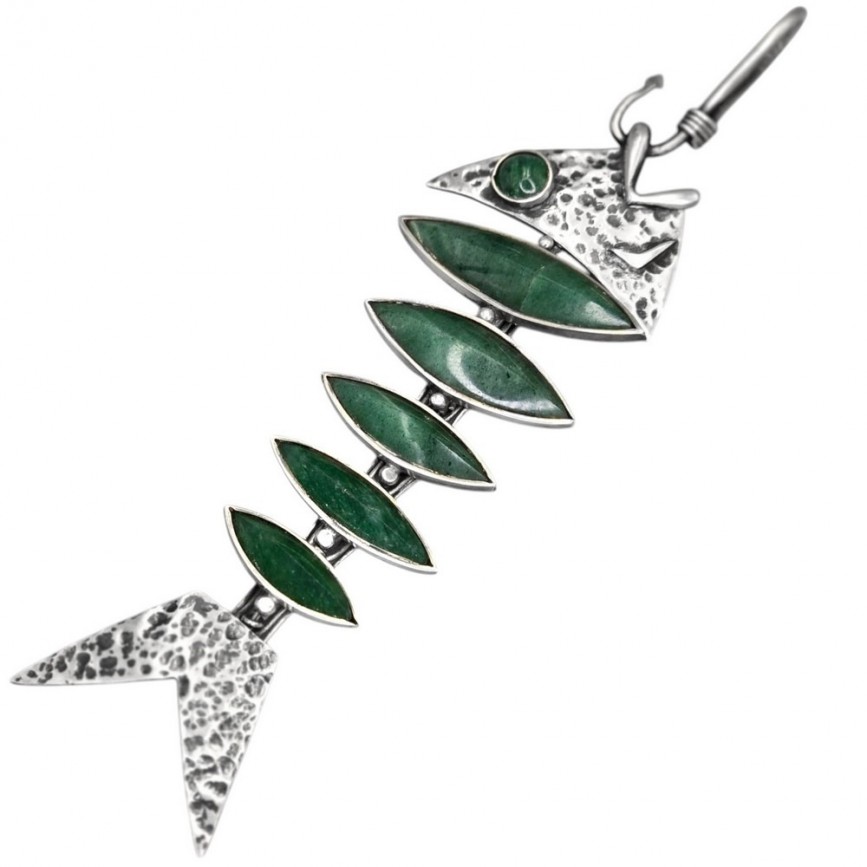 Bijuterie stilizată sub forma unui schelet de pește prins într-un cârlig, inedit elaborată în manieră modernistă, specifică artizanilor mexicani de la mijlocul secolului XX.