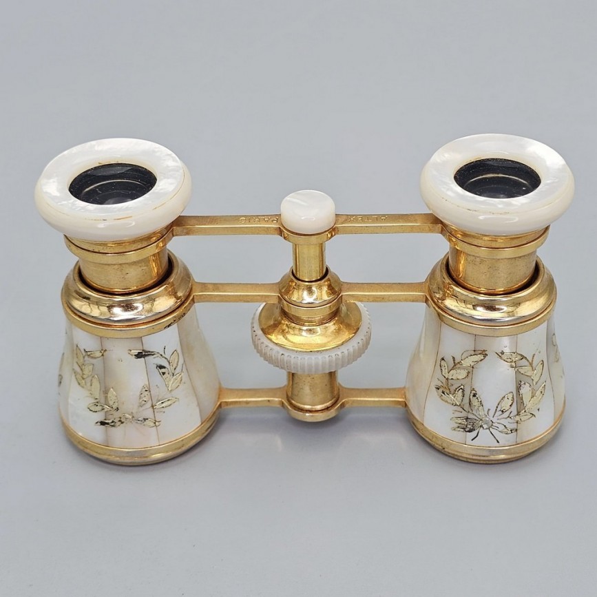 Structura metalică aurită, cu brațe subțiri și mecanism central de focalizare, reflectă estetica clasică a binoclurilor de teatru pariziene.
